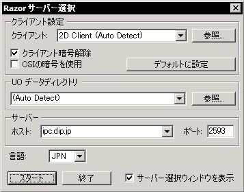 Razorを実行すると左のような画面が現れます。この画面の通りに合わせてください。サーバー名は、ipc.dip.jp です。ポートは2593と設定します。あとはスタートボタンを押すだけです。